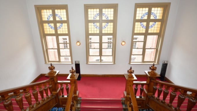 Matatagpuan ang pasukan ng dating gusali ng pamahalaang panlalawigan sa ikalawang palapag ng Bunsyokan. Pagpasok mo, sasalubungin ka ng mga mararangyang marmol na haligi at isang engrandeng hagdanan na patungo sa ikatlong palapag. Sa landing ng hagdanan, makikita ang napakagandang stained-glass na bintana na may disenyo ng korona mula sa dahon ng laurel—isang obra na nagpapakita ng ganda at karangyaan.